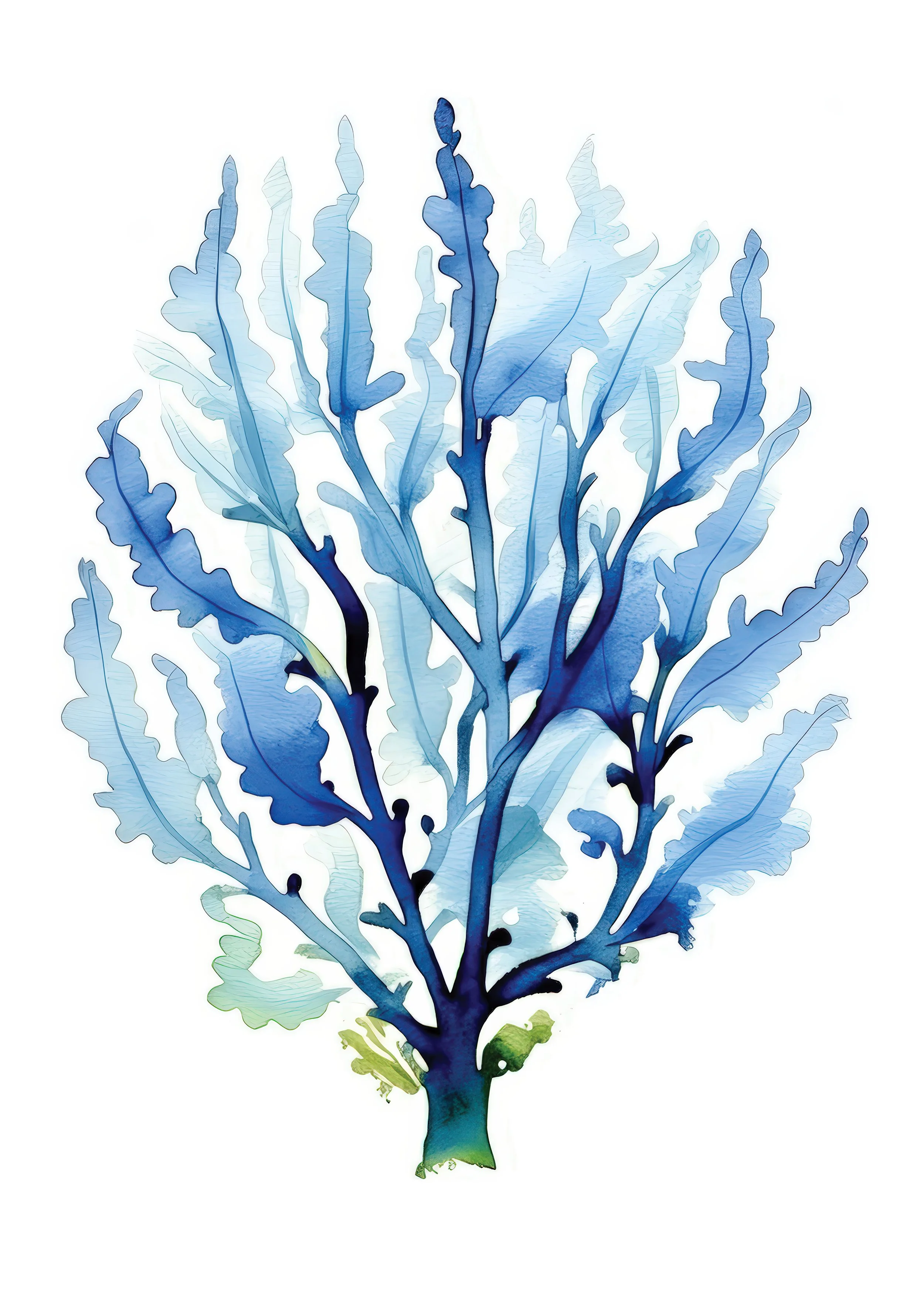 Watercolor illustration of a blue and green seaweed branch on a white background.